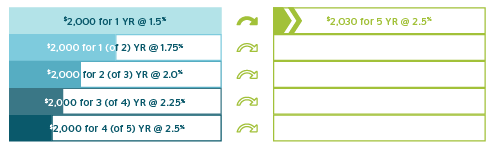 You now have $2,000 to invest in five individual GIC terms, ranging from 1 to 5 years. Using some example interest rates, your investments for Year 1 could look like the pie chart on the right.
