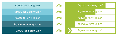 The chart below shows how GIC laddering would affect your overall return, if you maintained this strategy for 10 years.