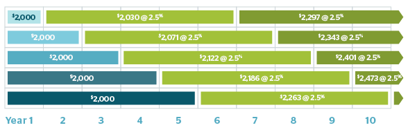Returns may not keep pace with inflation - While the example above showed a 27% return over 10 years, that’s still just a 2.7% average rate of return per year. The rate of inflation (which is the rate at which the prices for goods and services goes up or down) in Canada might be low today, but it has been as high as 2.38% over the last 10 years2. If the interest rate on your GIC is lower than the rate of inflation, your purchasing power with the investment when it matures will actually decrease.