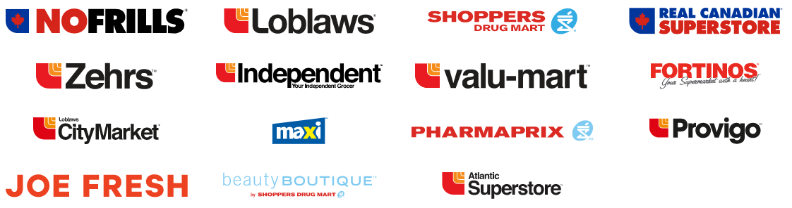 - Loblaws banner grocery stores: Loblaws, No Frills, Real Canadian Superstores, The Independent Grocer, Zehrs, Fortinos, wholesale club, and valu-mart